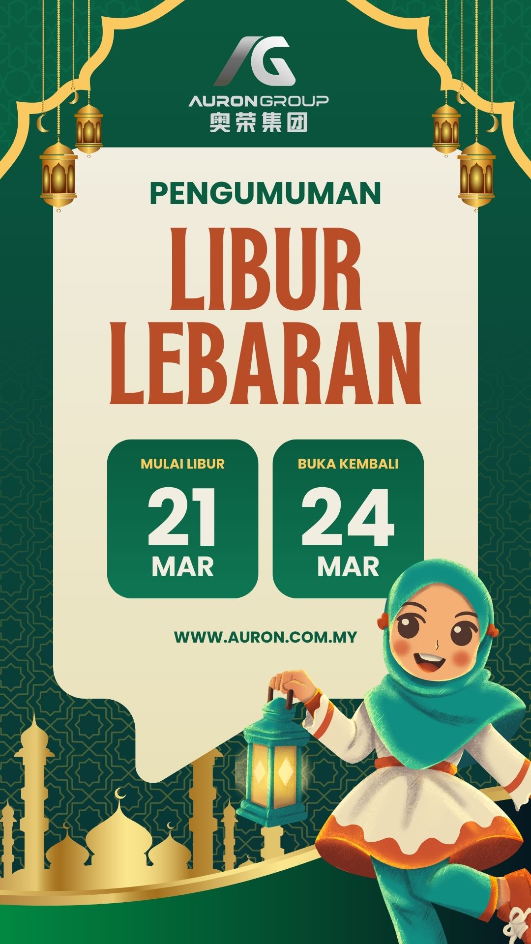 📡Dear Auron customer : 🔴Malaysia Office 🔹21 - 23 March 2026 (Offday) 🔹24 March 2026(Tuesday)Resume Work ✔️Office does not receive and reply any enquiry during the holiday. Wishing everyone a joyful and prosperous Hari Raya! May this festive season bring happiness, good health, and success to all. SELAMAT HARI RAYA 🌙 From all of us at AURON GROUP